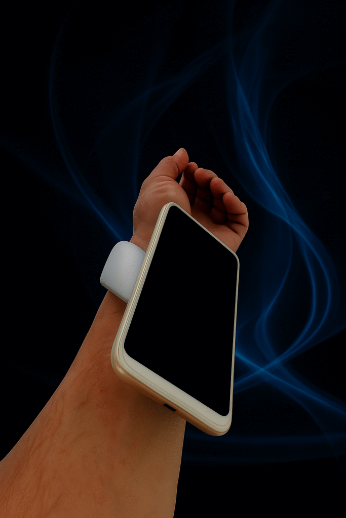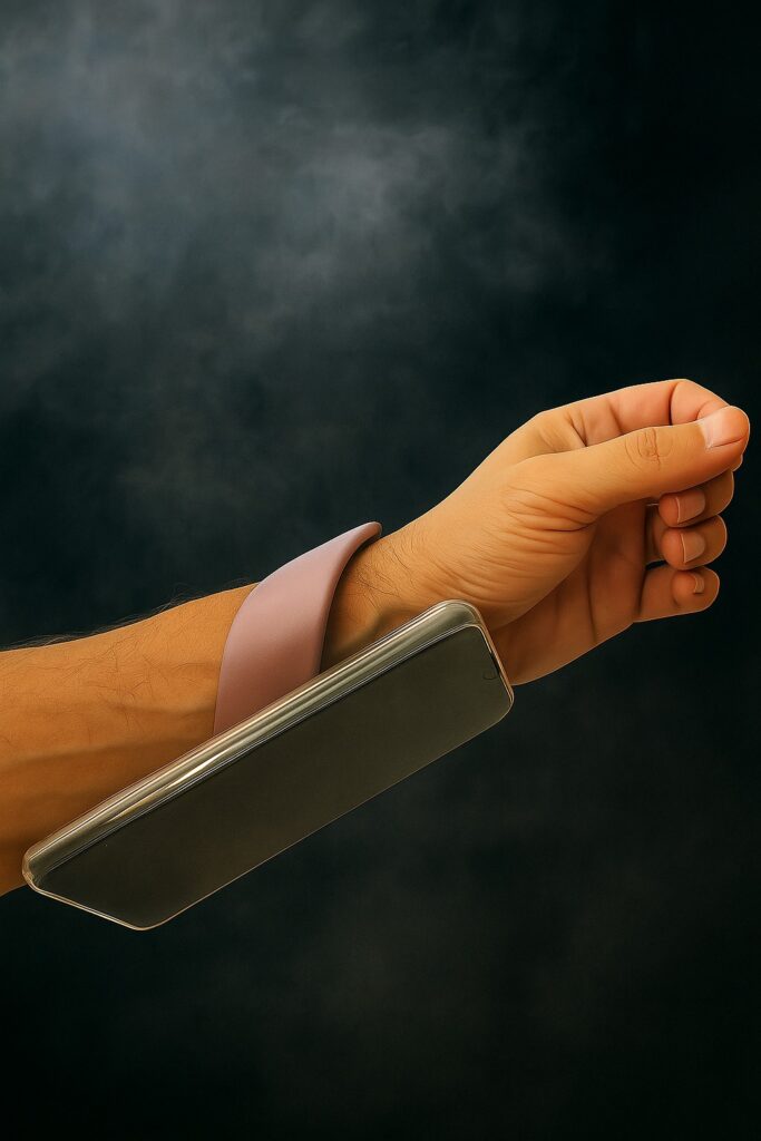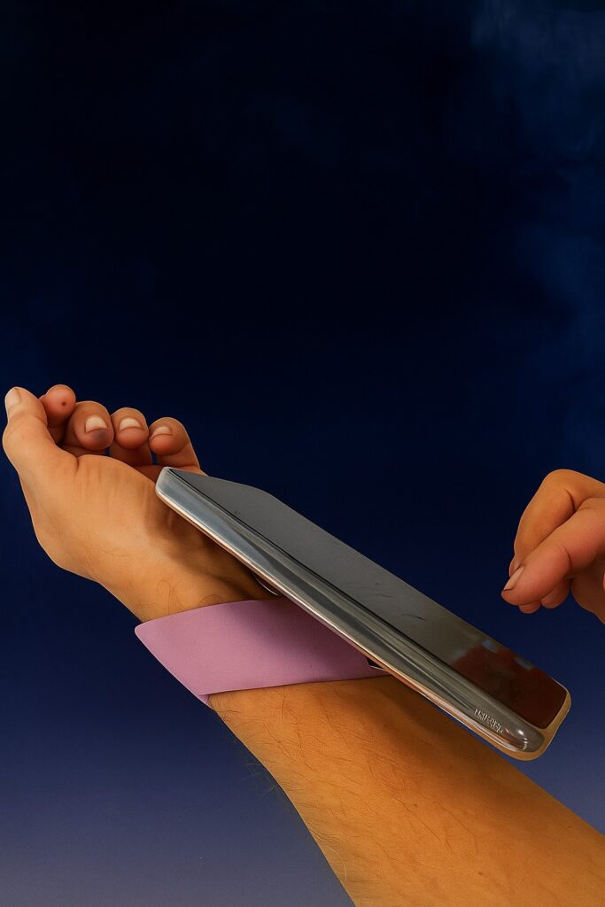 Accesorio versátil para sujetar el celular en el antebrazo, manteniéndolo cerca de los sentidos y del cuerpo. Su sistema de enganche es compatible con otros accesorios, permitiendo colocarlo en distintos espacios arquitectónicos.