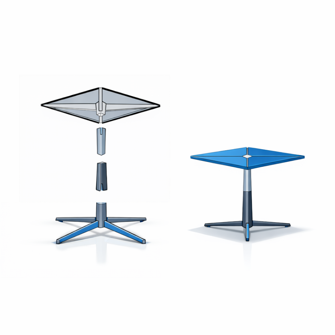 La superficie superior mantiene proporción equilibrada para uso doméstico, comercial o institucional, mientras que la base estructural garantiza estabilidad mediante una distribución radial eficiente de cargas. El sistema de unión está pensado para montaje intuitivo y repetible, reduciendo tiempos de instalación.